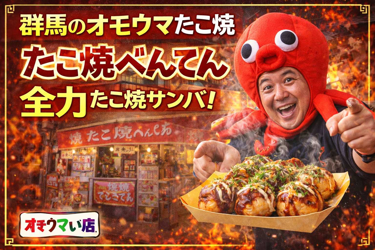 群馬県の「オモウマい店」たこ焼き記事を書くなら、主役はやはり 高崎市の「たこ焼べんてん」 です。番組公式には、2022年12月27日放送回で たこ焼580円、2024年8月13日放送回で さっぱりレモンネギ780円 とともに掲載され、店の代名詞は “全力たこ焼きサンバ”。現在も地域情報サイトでは、高崎市棟高町130-2、12:00〜18:00、材料終了次第閉店、不定休、テイクアウト専門 と案内されています。