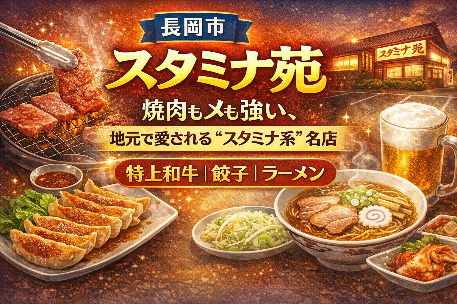 長岡で「今日はしっかり肉を食べたい」「家族や仲間とワイワイ焼肉したい」と思った時、名前が挙がりやすいのが大衆焼肉店「スタミナ苑」。新潟県産の黒毛和牛を中心に、焼肉・ホルモンはもちろん、**餃子とラーメンが“裏名物”**として語られる、ちょっと珍しいタイプのお店です。